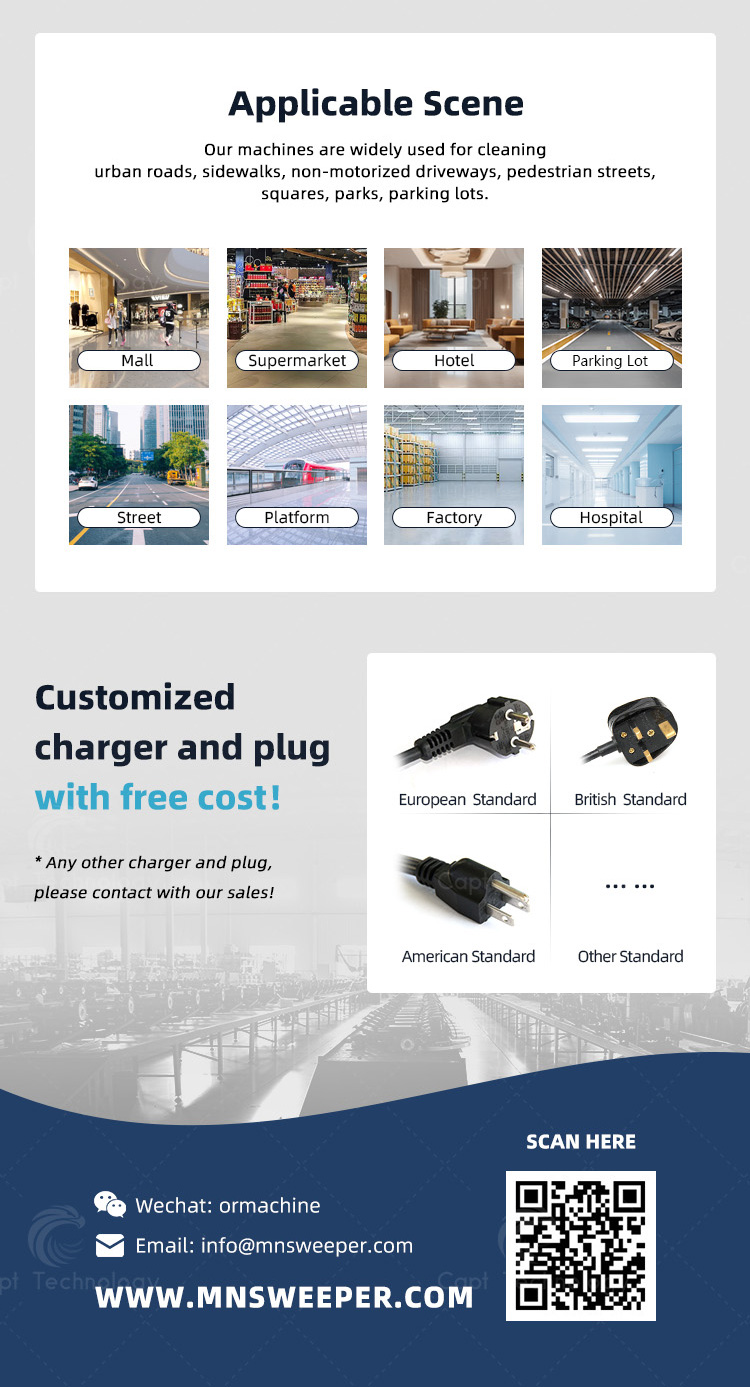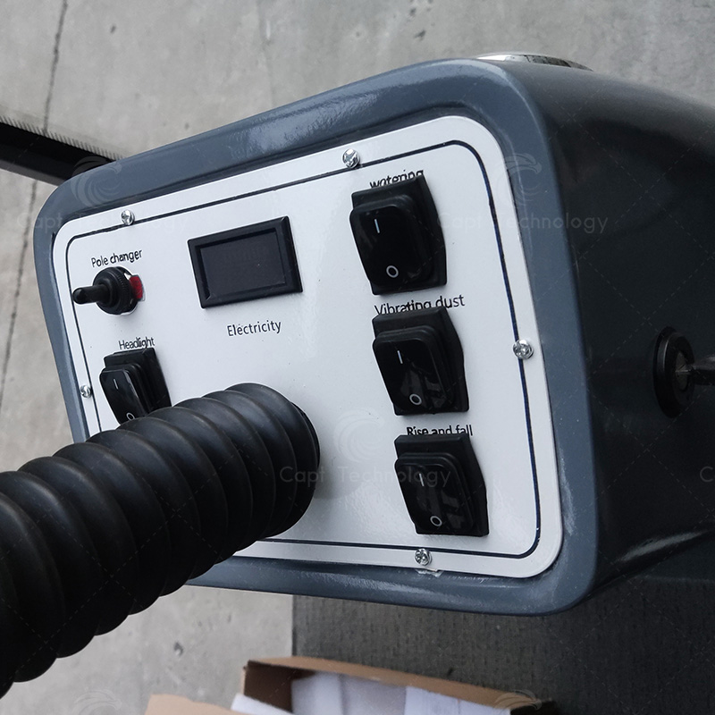 It can automatically adjust the lifting of brush when working, two-side brushes can collect the waste to the middle position by throwing-off of main brush to the waste hopper. In case that the dust is large, press the dust vibration button to maintain the cleanliness of the filter and to ensure the cleaning effect.
