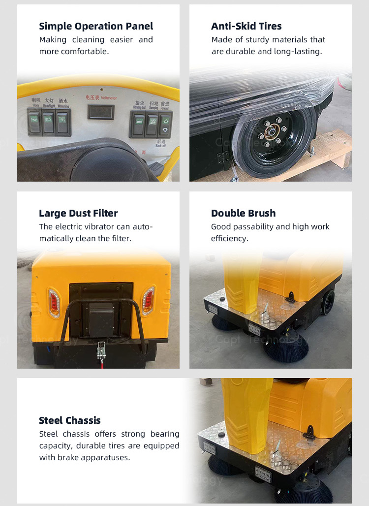 This riding sweeper is mainly suitable for places with flat ground and relatively good environment, such as municipal roads, property communities, airports, enterprises, large garages, colleges and universities, and high-end villa areas.