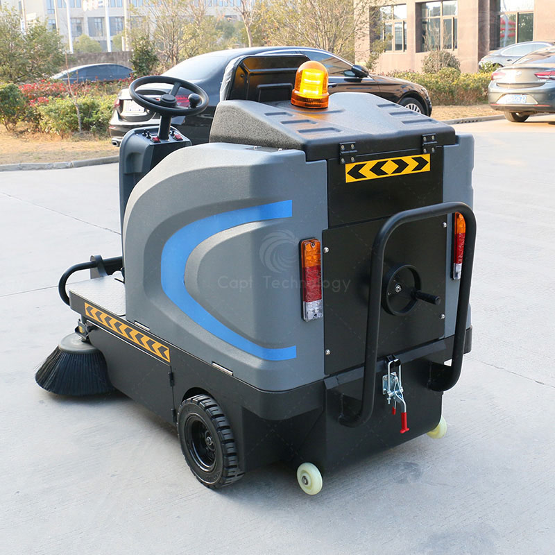 CAPT-E8006 driving sweeper has high cleaning efficiency and can clean up dust, stones, wood chips, glass and other garbage. It is suitable for operation on the flat ground such as cement, asphalt, ceramic tile, marble, etc., and can clean dust, stones, wood chips, glass and other garbage.