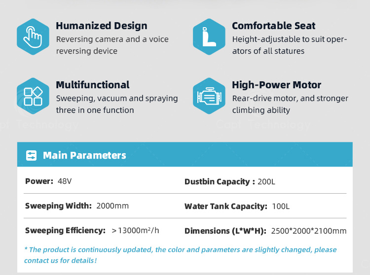 It is a relatively popular sweeper has high cleaning efficiency of vacuum, sweeping and watering. Designed with enlarged chassis, the sweeping width is 2000mm, which offers high work efficiency. Use of high-performance maintenance-free batteries, featured by no leakage and no harmful gases.    The large-capacity dustbin design can clean a larger area at one time, without dumping garbage frequently, and improve work efficiency.
