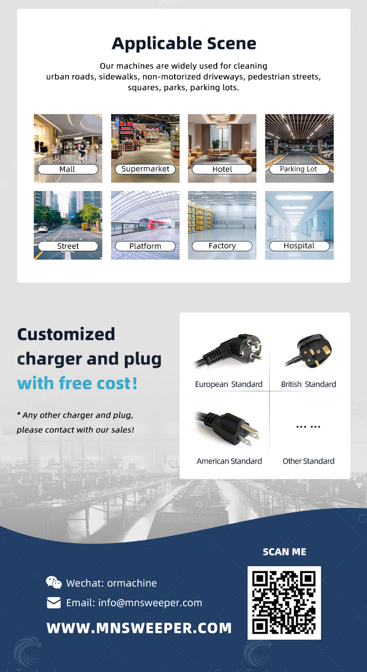 This sweeper is small and flexible, can turn on the spot, and can enter the elevator, especially suitable for working in small spaces, such as various office buildings, shopping malls, hospitals, schools, sidewalks, etc.