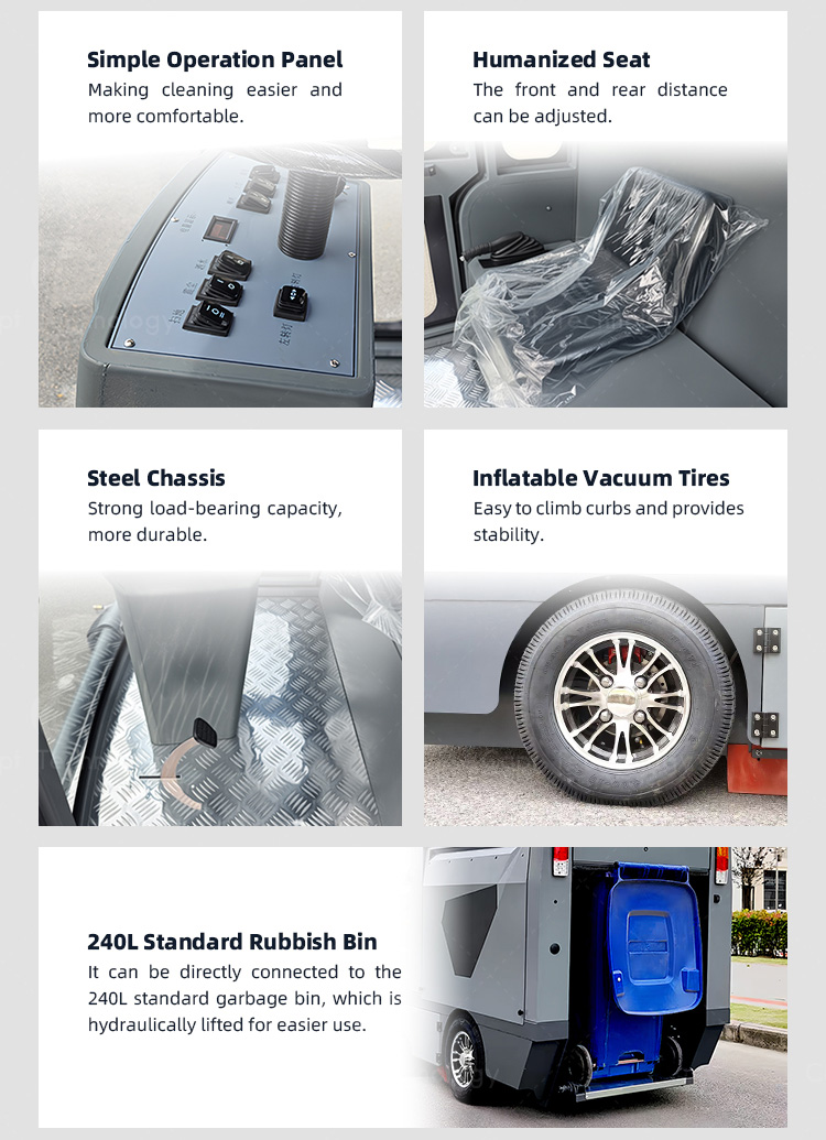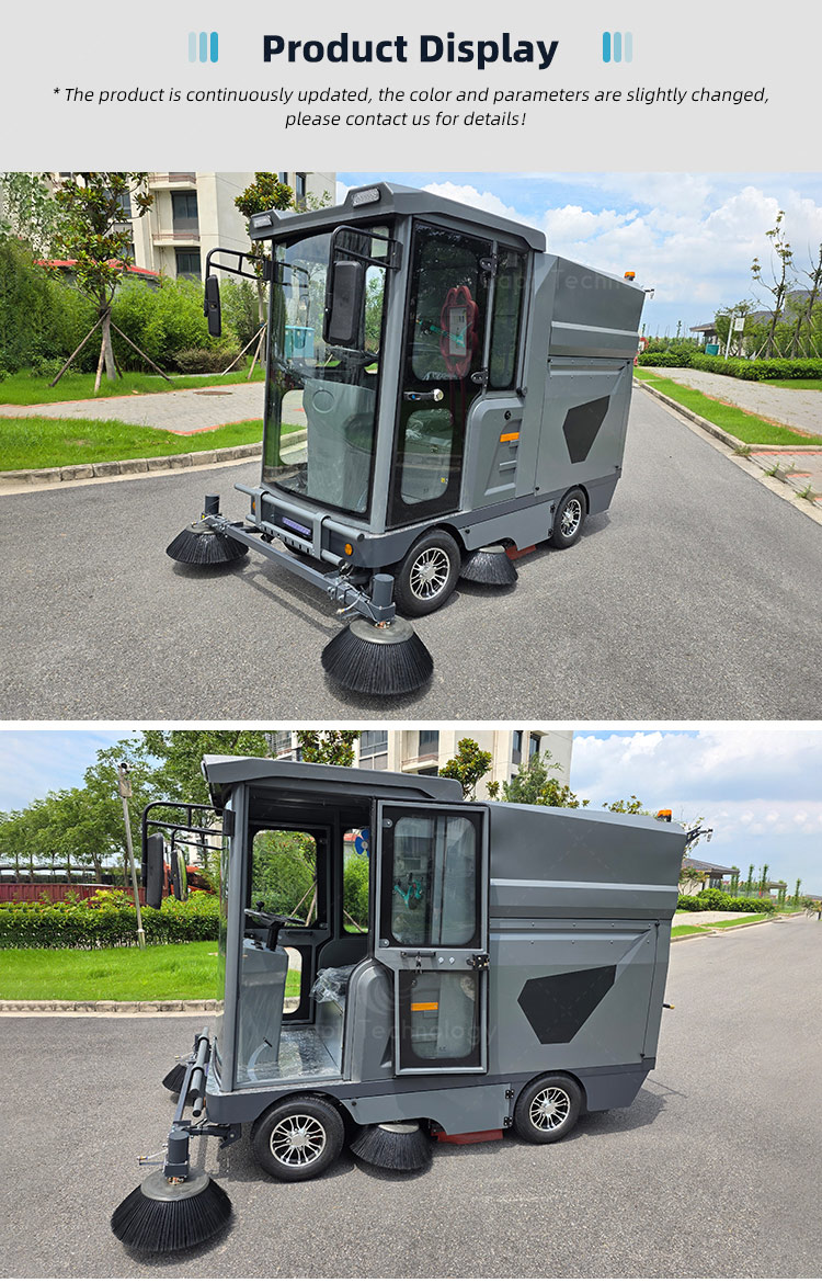 This fully enclosed four-wheel drive sweeper is an electric garbage sweeper that integrates cleaning, vacuum and watering. Mechanized operation not only has high cleaning efficiency and good results, but also can clean everything, such as dust sand, stones, leaves, and cigarette boxes, bottles and etc.