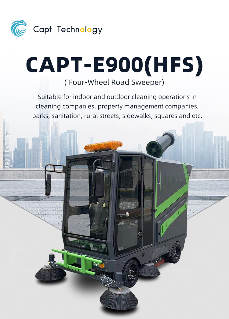 CAPT-E900 enclosed sweeper adopts fully enclosed cab design, and it is mostly suitable for using in extremely cold and harsh environment. Mostly for outdoor use, suitable for high-end residential areas, resorts, scenic areas and other large areas of cleaning.