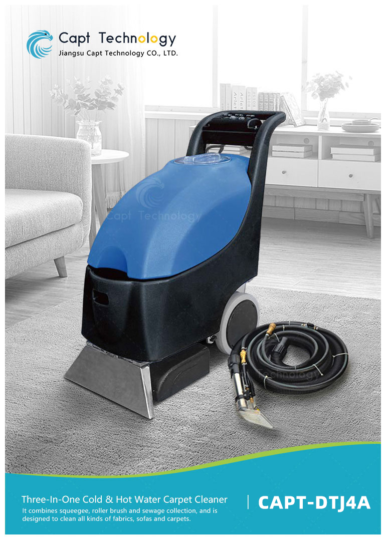 The three-in-one cold & hot water carpet cleaner combines squeegee, roller brush and sewage collection, and is designed to clean all kinds of fabrics, sofas and carpets. Mainly used in offices, hotels, halls and other carpet sites. The body is made of stainless steel frame, the carpet fiber can be thoroughly cleaned, and the machine is equipped with an external hand-held water spray connector. Transparent rotary sewage tank sealing cover design, dust-proof transparent water tank cover. When adding water, no dirt is taken into the water tank to reduce the risk of blockage of the nozzle.